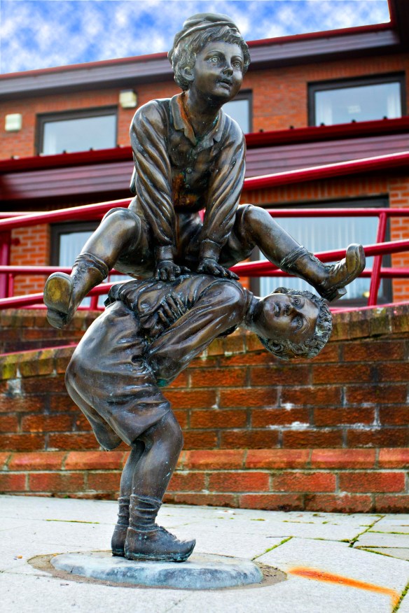 This statue is in the grounds of Saint Patrick’s Primary School Dungannon. It was placed there by the school principal Mary Hampsey to commemorate the lives of two pupils of the school Cian Corrigan and Ryan Pearson. Ryan died in a drowning accident in 2000 while on a family holiday he was only five years old while Cian passed away in May 2009, aged 11 years, from a rare spinal cord tumour. The statue forms the centre piece of a small memorial garden.