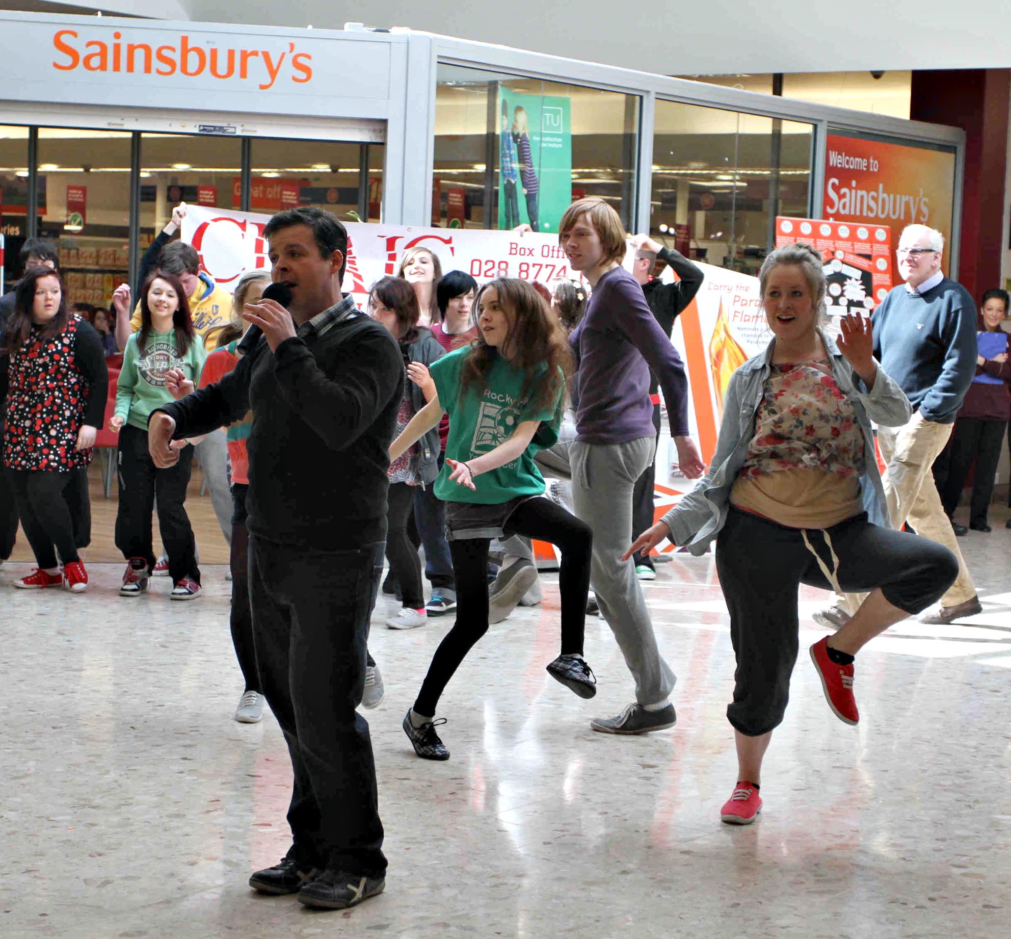 Members of the cast of who took part in a flash mob in Sainsbury’s Dungannon store this morning to promote their show “Make Mine A Musical”. It opens on Wednesday night May 2nd and runs until Saturday. This is Declan McGrath taking the lead in a song from the show. 70 members of The Craic Youth Theatre took part. Despite much poor publicity about Coalisland recently there are some great things happening in the town not least The Craic Theatre.