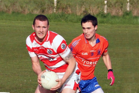 This is action from a gaelic football match which I was covering for a local newspaper the “Tyrone Herald” on saturday evening between Moortown (red & white hoops) and Ardboe. The teams are near neighbours and as a result there is intense rivalry between them. This game had an extra edge as one of the Ardboe players had recently defected from the Moortown team. This is a rare enough event in club football especially were a player goes to play for the “other side”. Ardboe were the eventual winners of what turned out to be a very poor game. The two players are Peter Devlin (Moortown) and Shea McGuigan (Ardboe)