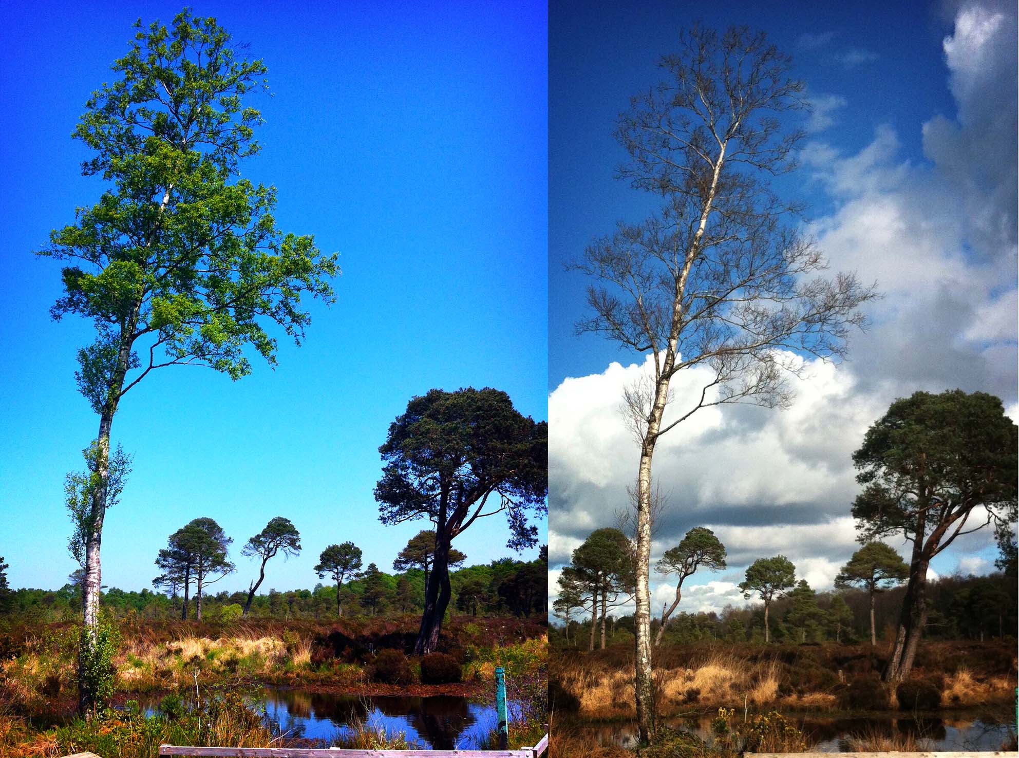 The weather over the past few days has been warm and sunny. Following one of the wettest Aprils on record we now have one of the better May’s in a while. You can see the growth on the birch tree in Peatlands park. The photo on the right was taken in March