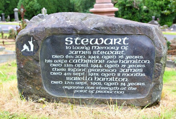 I was in Belfast today and between appointments spent a while in the City Cemetery which is bordered by the Falls and Whiterock Road. I used to spend many lunch times wandering around this historical and fascinating place. This is the grave of James Stewart who died on January 6th 1942. His people were weavers who came from the Lissue area of Lisburn who moved to Belfast in 1861 and they lived in Marine Street in the docks area were James was born on July 11th 1866. They then moved to Lincoln St off the Falls road. After marriage he and his family lived inLeopold Street off the Shankill Road until his death. He was a life long cricket fan and was a member of Woodvale Cricket Club. He was also a socialist and his left wing politics and his love of cricket are reflected on his headstone with the batsman and wicket keeper carved on the top left hand side of the stone and the words “Organise our strength at the point of production” which is a quote from the second international. His son Charles was a republican who fought in the Irish War of Independence with the 2nd Battalion Belfast Brigade of the IRA and during the Civil War with the East Mayo Roscommon anti treaty forces. Charles was captured in the North and spent some time in Crumlin Road Jail as well as time on the prison ship The Argenta and in Derry Jail before being released in 1924. Charles Stewart is buried in Milltown Cemetery which is on the opposite side of the Falls Road from the City Cemetery.