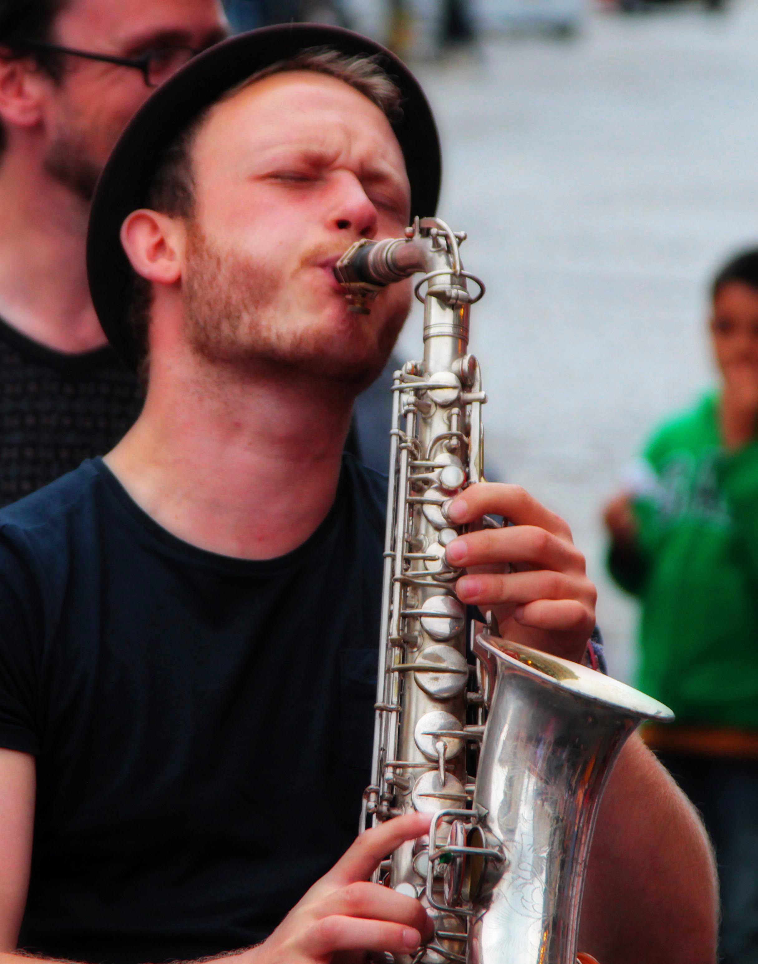 This is a sax player on the Royal Mile in Edinburgh entertaining the crowd during The Edinburgh Festival. The Edinburgh Festival is a collective term for many arts and cultural festivals that take place in Edinburgh, Scotland each summer, mostly in August. Though the festivals are put on by various organizations unrelated to each other, and so are officially separate events, they are regarded by many visitors as part of the same event; and together they form the largest annual cultural festival in the world.