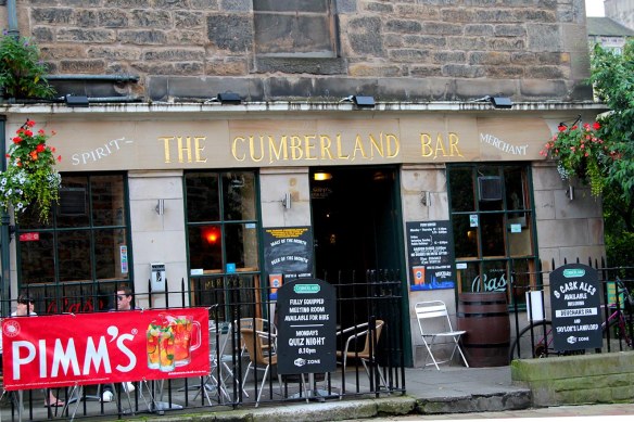 This is The Cumberland Bar in the New Town in Edinburgh. The Bar has been immortalised as the stereotypical New Town pub in Alexander McCall-Smith’s serialised novel 44 Scotland Street, the Cumberland has an authentic, traditional wood-brass-and-mirrors look (despite being relatively new) Many of the characters of the novels frequent the Cumberland including Bruce, Pat, Stuart and Matthew as well as Angus Lordie and his dog Cyril. Cyril is a beer drinking canine with a gold tooth who winks at the ladies. In one of the books Cyril is impounded under threat of death for biting, it is to the Cumberland Bar that he returns to celebrate his reprieve.