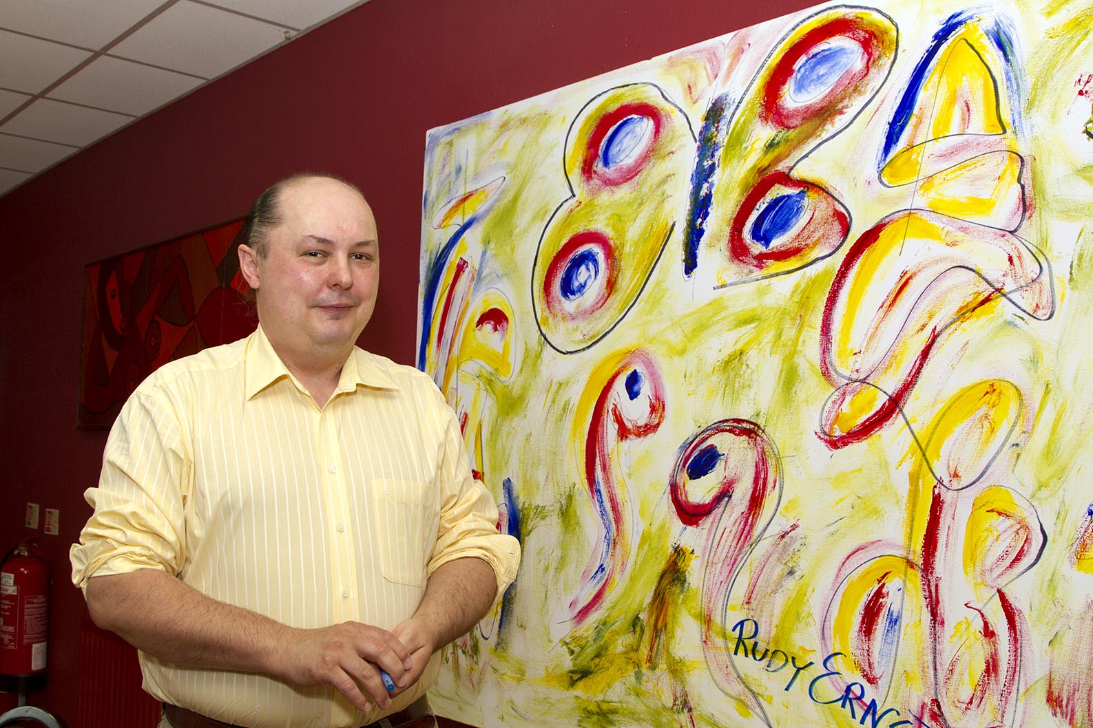 This is Maciek Kotarski an artist originally from Lodz in Poland but now lives and works in Coalisland. He has only been painting for under two years but has a exhibition of his work in the foyer of the Craic Theatre Coalisland. He is a big fan of the American artist Rudy Ernst and did a tribute painting to him especially for Craic.