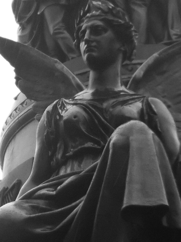 I was in Dublin today at a conference and on my way back to the train station I managed to grab a photo (despite the torrential rain!!) of one of the “Victories” at the base of the O’Connell Monument at the southern end of O’Connell Street. This monument was designed by John Henry Foley, completed by Thomas Brock and was unveiled in 1882. Foley also designed the Prince Albert memorial in Hyde Park London. This particular Angel was wounded during the 1916 uprising with a bullet wound to the right breast. There are four “Victories” at the base of the statue representing Patriotism, Courage, Eloquence and Fidelity.
