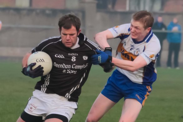 I had to cover the Tyrone all county league GAA semi final at O’Rahilly park for the Tyrone Herald. It was a very cold day and the general feeling is that it’s wrong to be playing football at this time of year. However my team, Clonoe O’Rahilly’s won beating Errigal Ciaran and will now play our arch rivals and neighbours Coalisland Fianna in next weeks final. This is Stephen McNulty Clonoe with the ball being tackled by Stiofan Tierney (Errigal Ciaran)